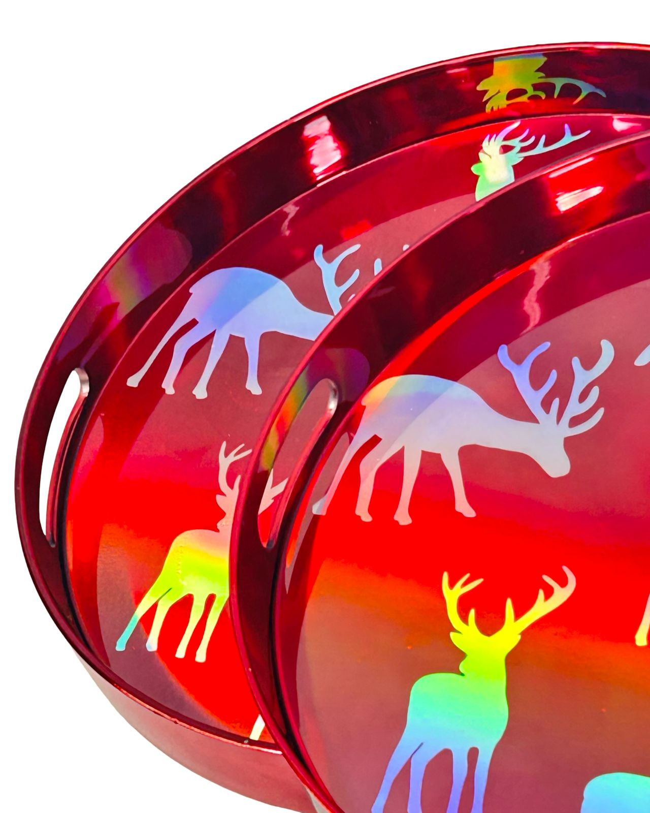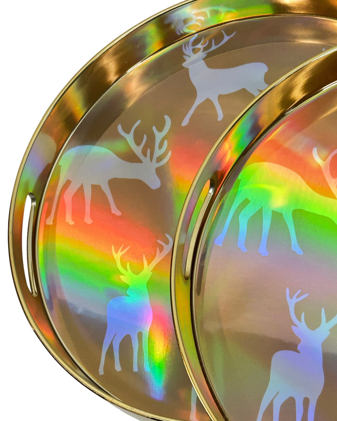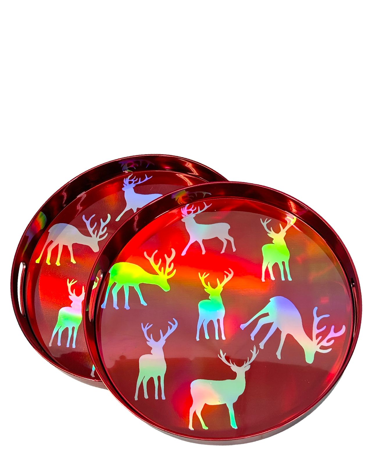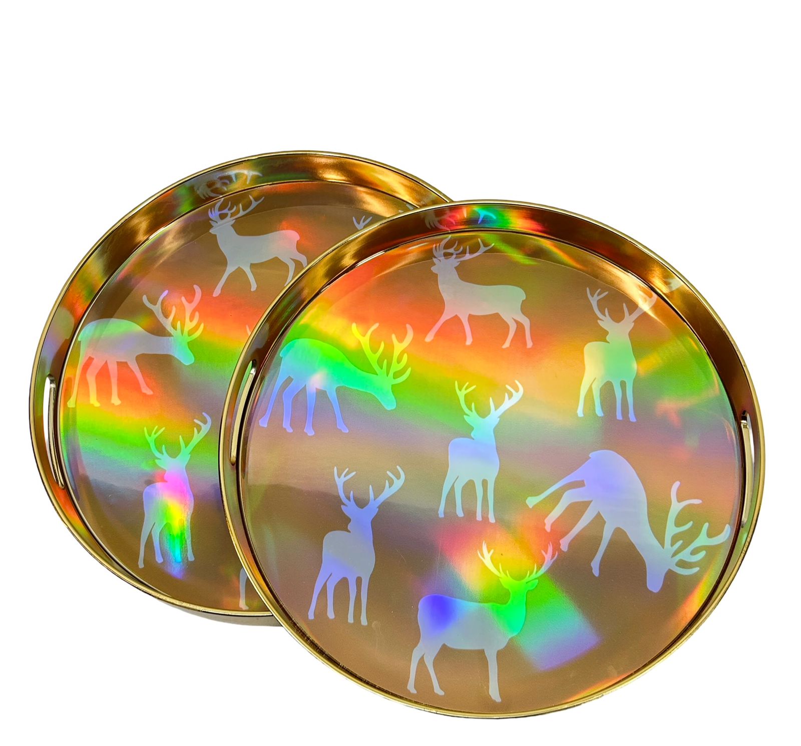 Este set incluye dos bandejas redondas doradas con detalles de renos, en tamaños de 37 y 35 cm de diámetro. Sus acabados elegantes y festivos aportan un toque sofisticado a cualquier ambiente, ideales para decorar y presentar aperitivos con estilo durante la temporada navideña. La combinación de tamaños permite versatilidad en su uso, desde servir hasta exhibir elementos decorativos con distinción.