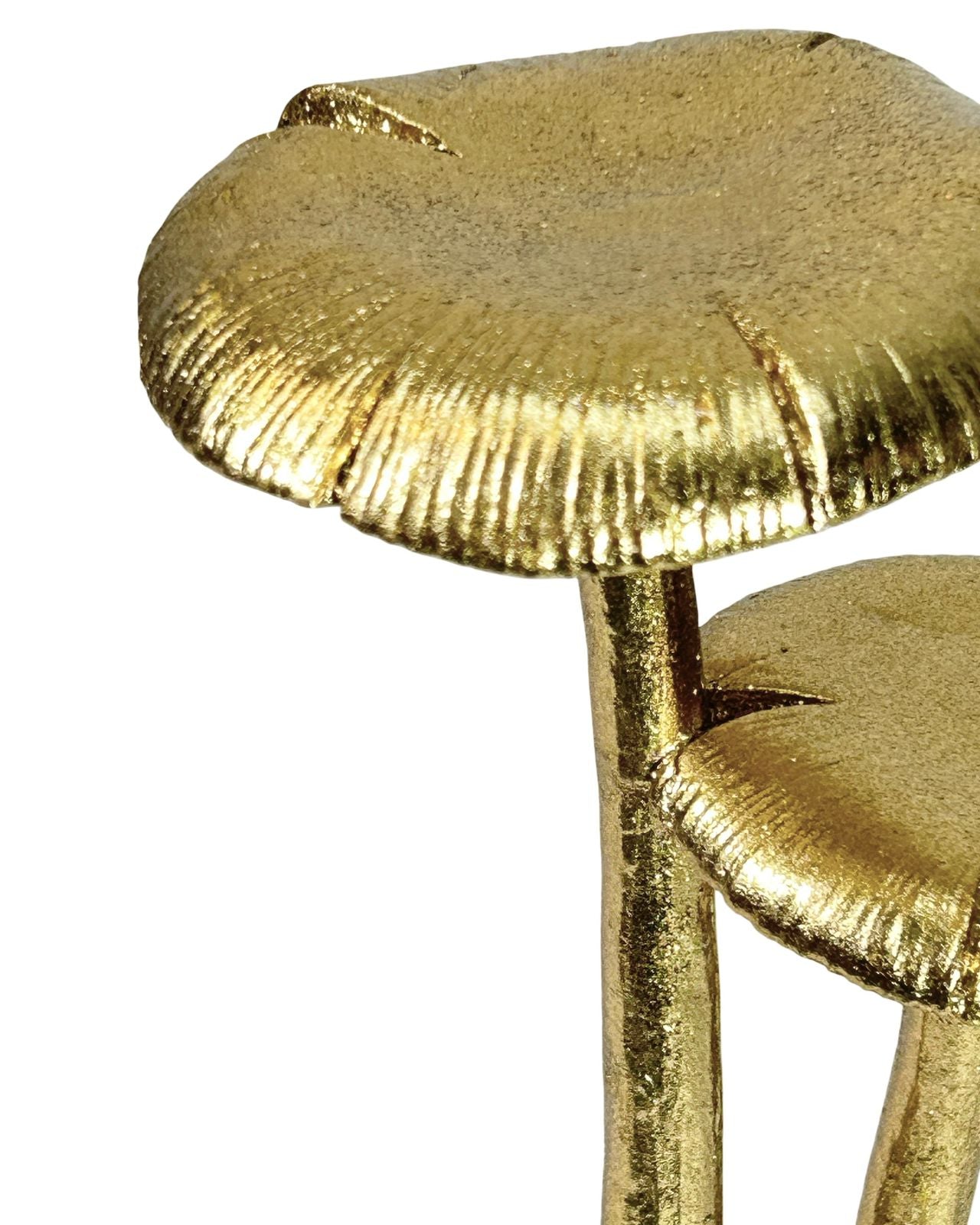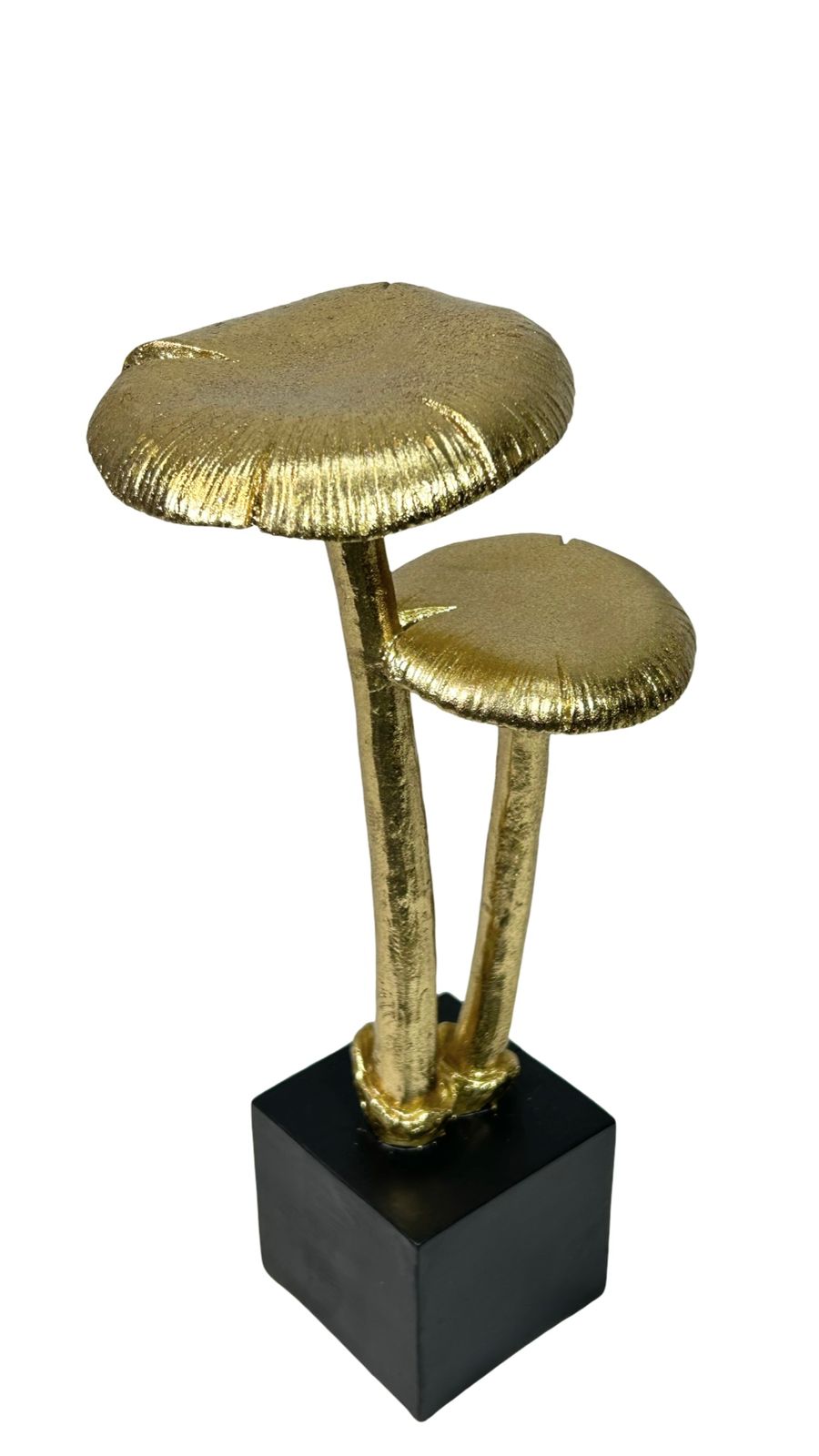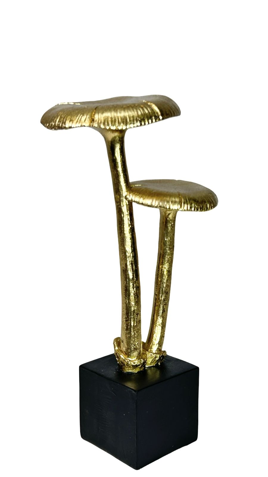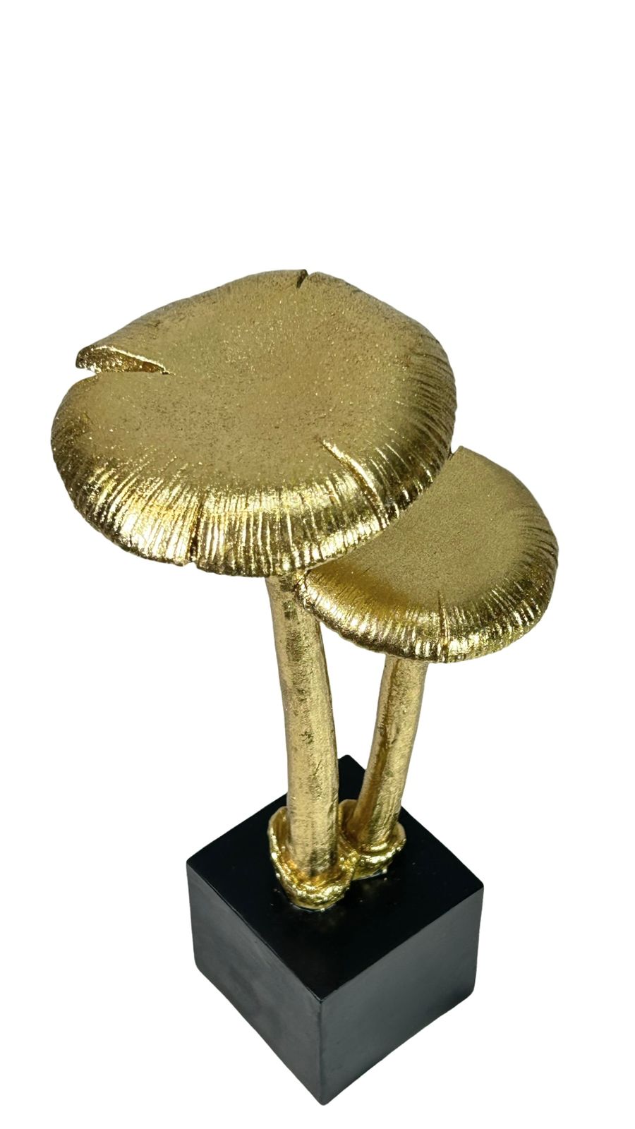 Conjunto de dos hongos decorativos en acabado dorado que aportan elegancia y calidez a cualquier espacio. Cada pieza mide 15x28 cm y descansa sobre una base negra que contrasta perfectamente, creando un efecto visual sofisticado. Ideales para estanterías, mesas de centro o rincones especiales, estos hongos combinan diseño contemporáneo con un toque natural. Su tonalidad dorada refleja la luz sutilmente, mientras que la base negra proporciona estabilidad y un anclaje visual que realza la decoración del hogar.