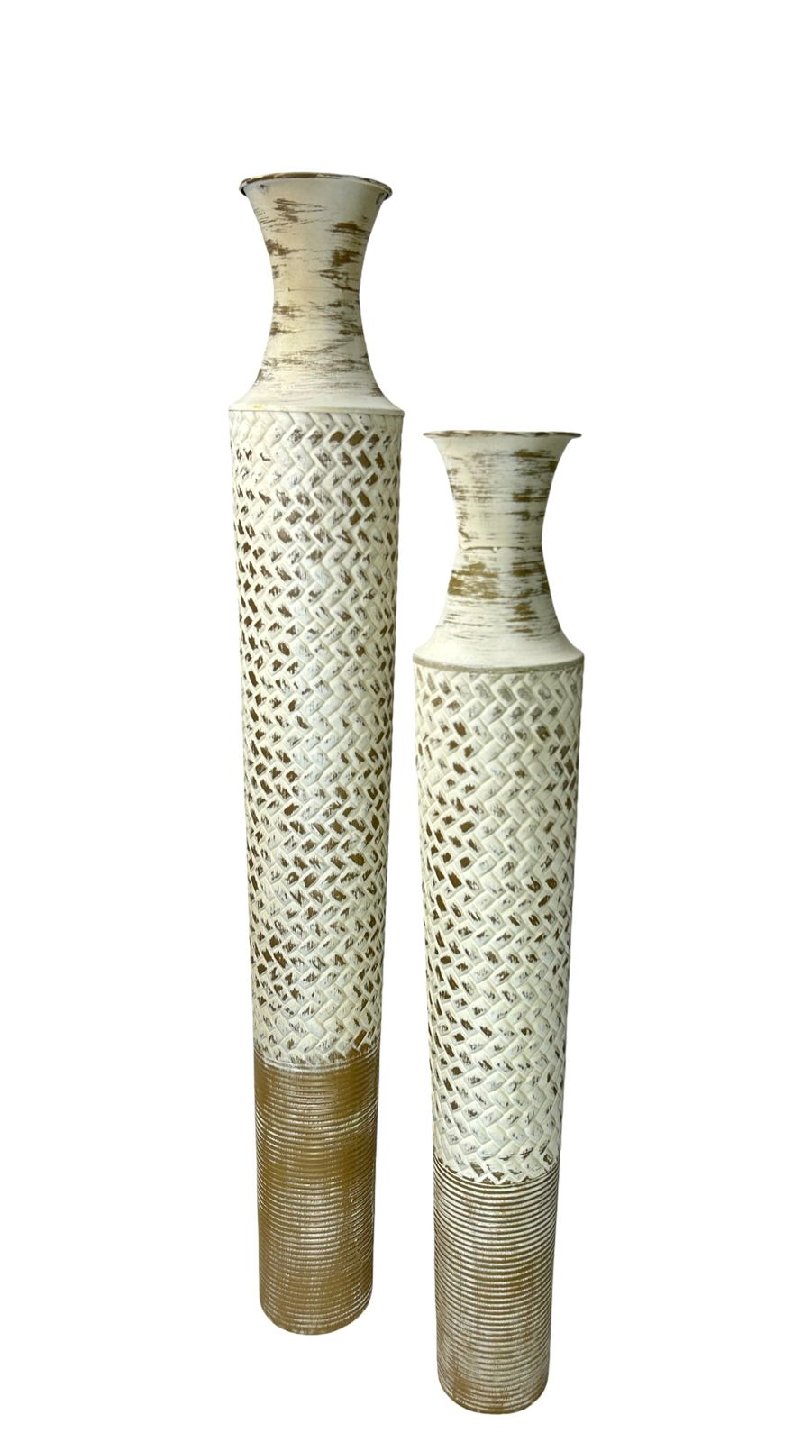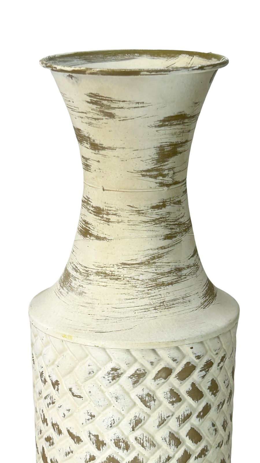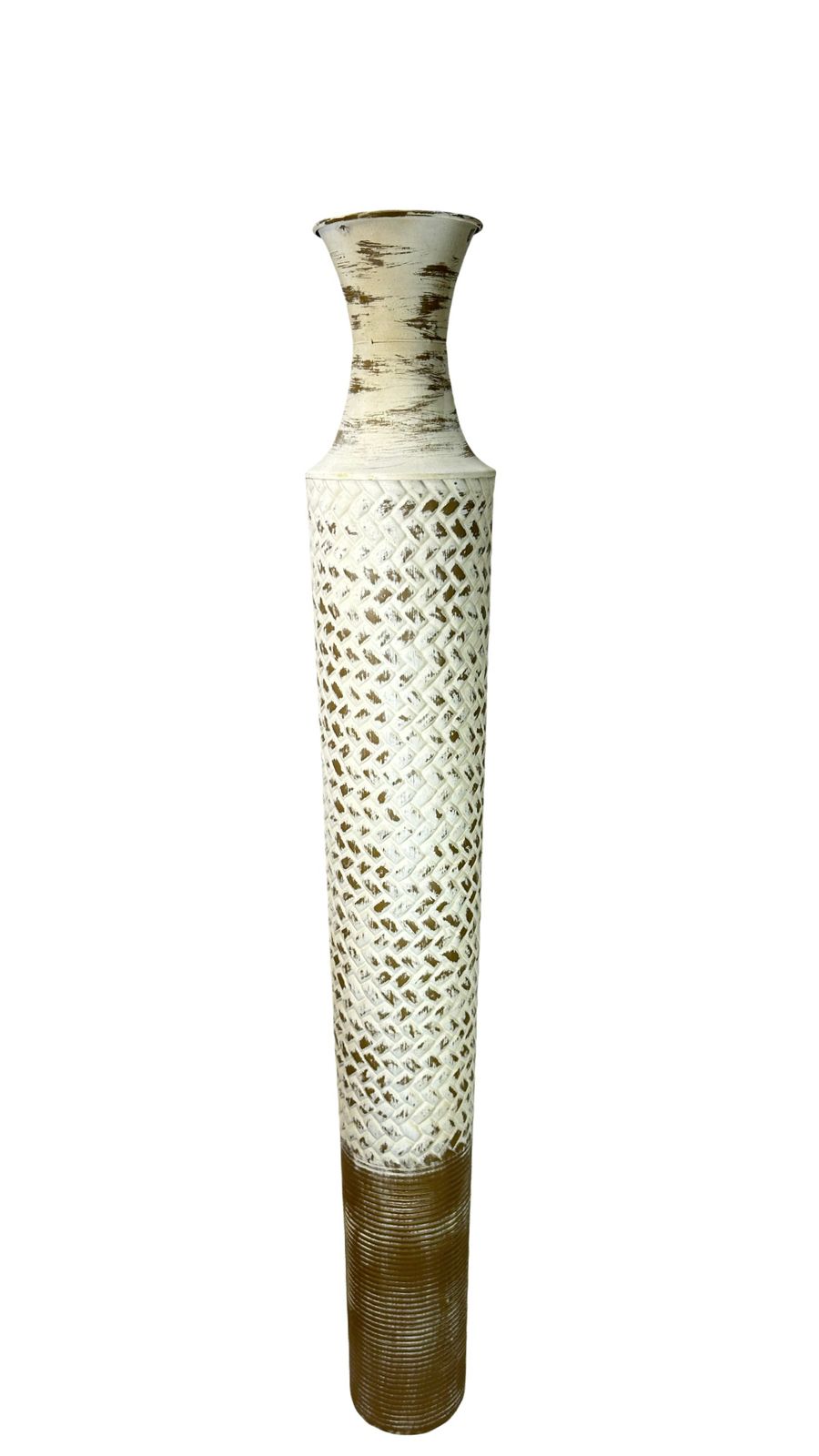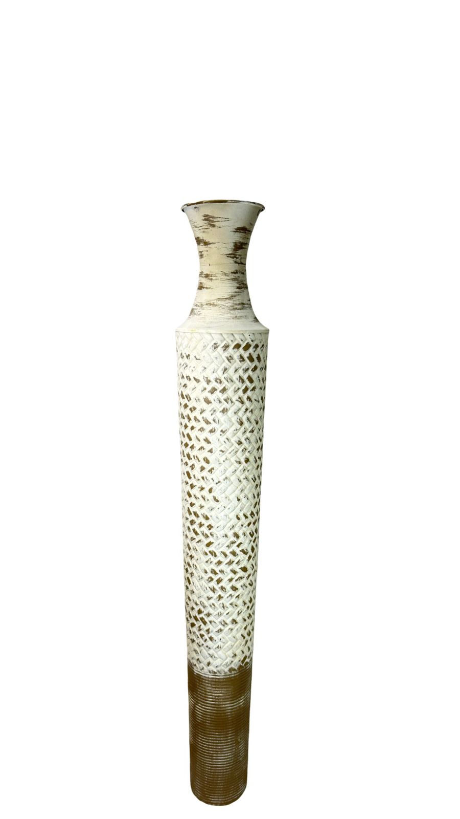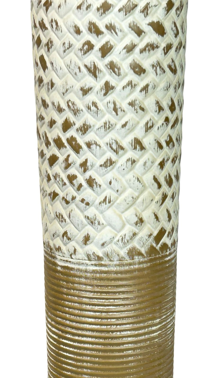 Jarrón de cerámica blanca con acabado elegante y detalles en latón que añaden un toque de refinamiento a cualquier espacio. Disponible en dos tamaños, este accesorio decorativo combina la pureza del blanco con los acentos metálicos para crear una pieza versátil que complementa tanto estilos clásicos como contemporáneos. Perfecto para exhibir flores frescas o como elemento decorativo independiente en mesas, repisas o consolas.