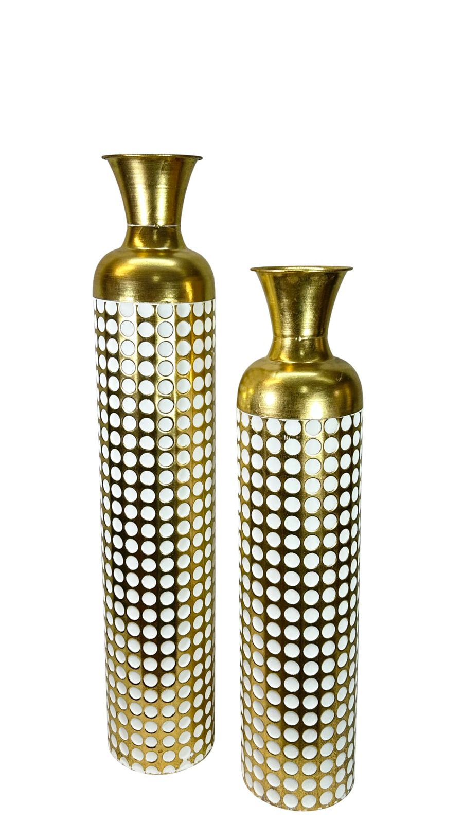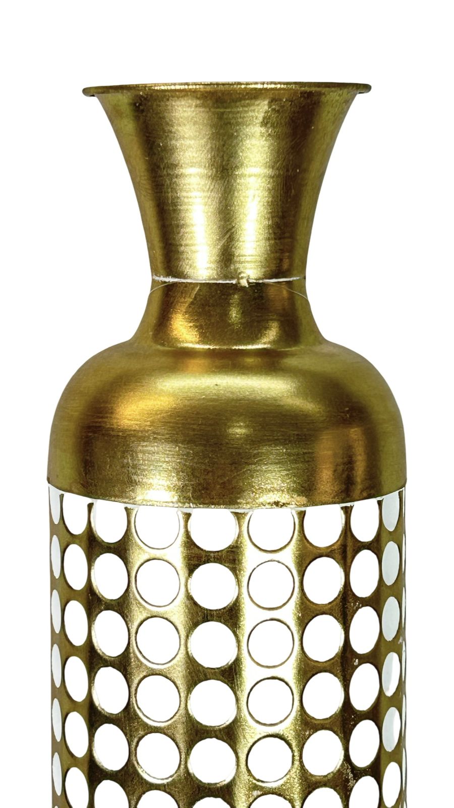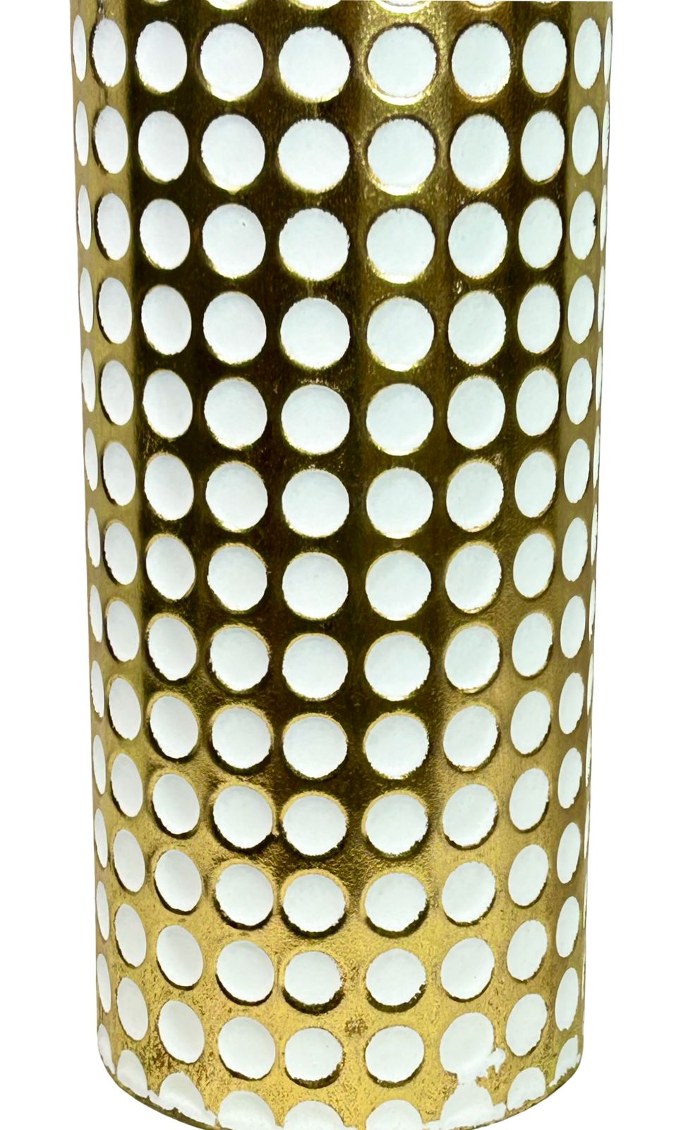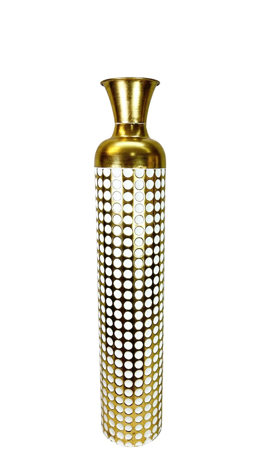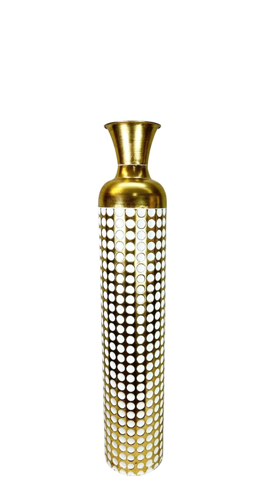 Jarrón de gran formato en acabado dorado metálico con detalles de puntos que capturan la luz de manera elegante. Disponible en dos tamaños para adaptarse a diferentes espacios y necesidades decorativas. Su diseño contemporáneo combina lujo y versatilidad, perfecto para complementar interiores modernos o clásicos. Ideal como pieza central en mesas, consolas o estanterías, añade un toque de sofisticación y brillo a cualquier ambiente.