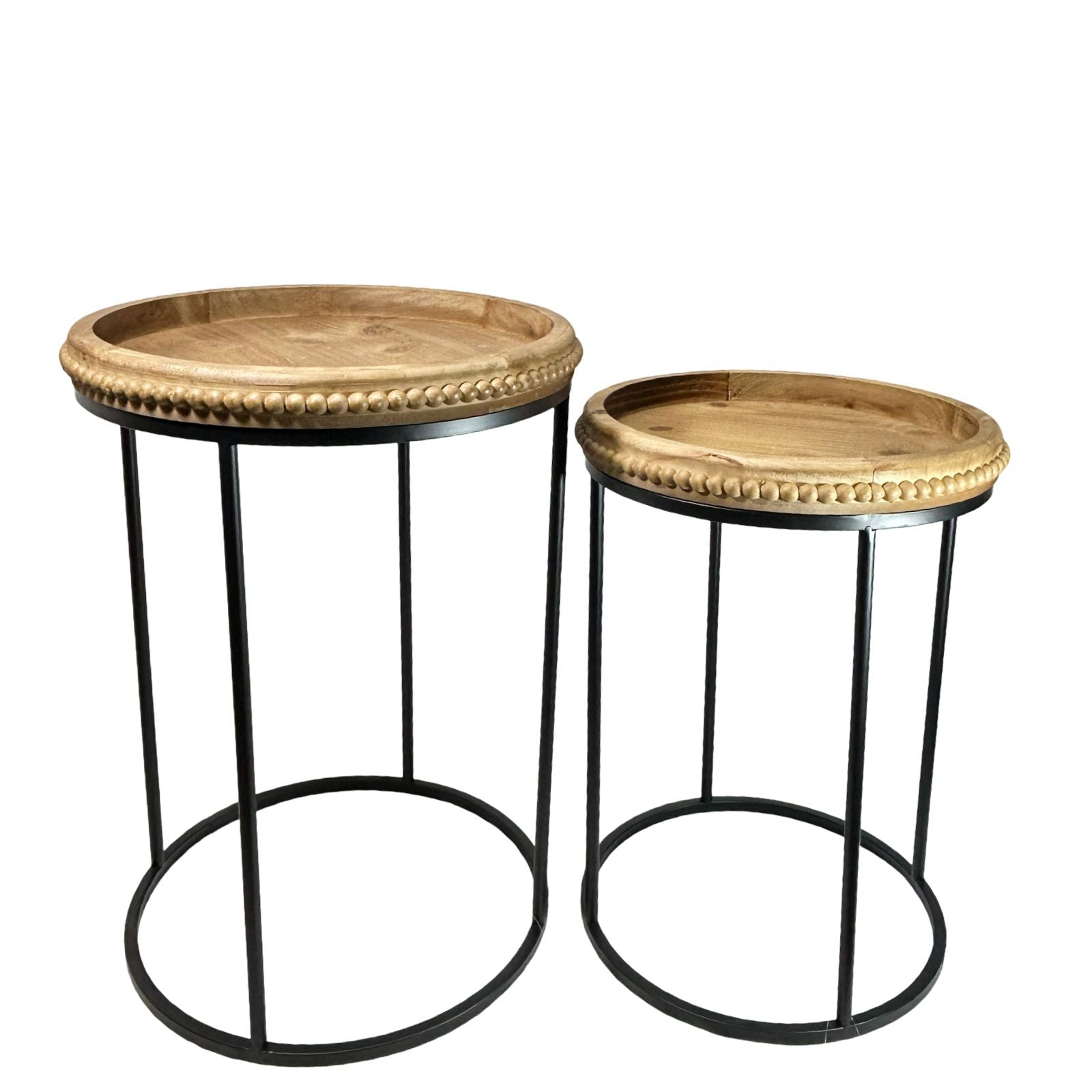 Conjunto de dos mesas auxiliares redondas elaboradas en madera, con diámetros de 59 y 62 centímetros. Diseño versátil que se adapta a diferentes espacios y estilos de decoración. Perfectas para complementar tu sala, recámara o área de estar, ofreciendo superficies funcionales y elegantes. Su estructura en madera natural proporciona calidez y durabilidad, mientras que sus proporciones compactas las hacen ideales para espacios reducidos o como piezas decorativas estratégicamente distribuidas en tu hogar.