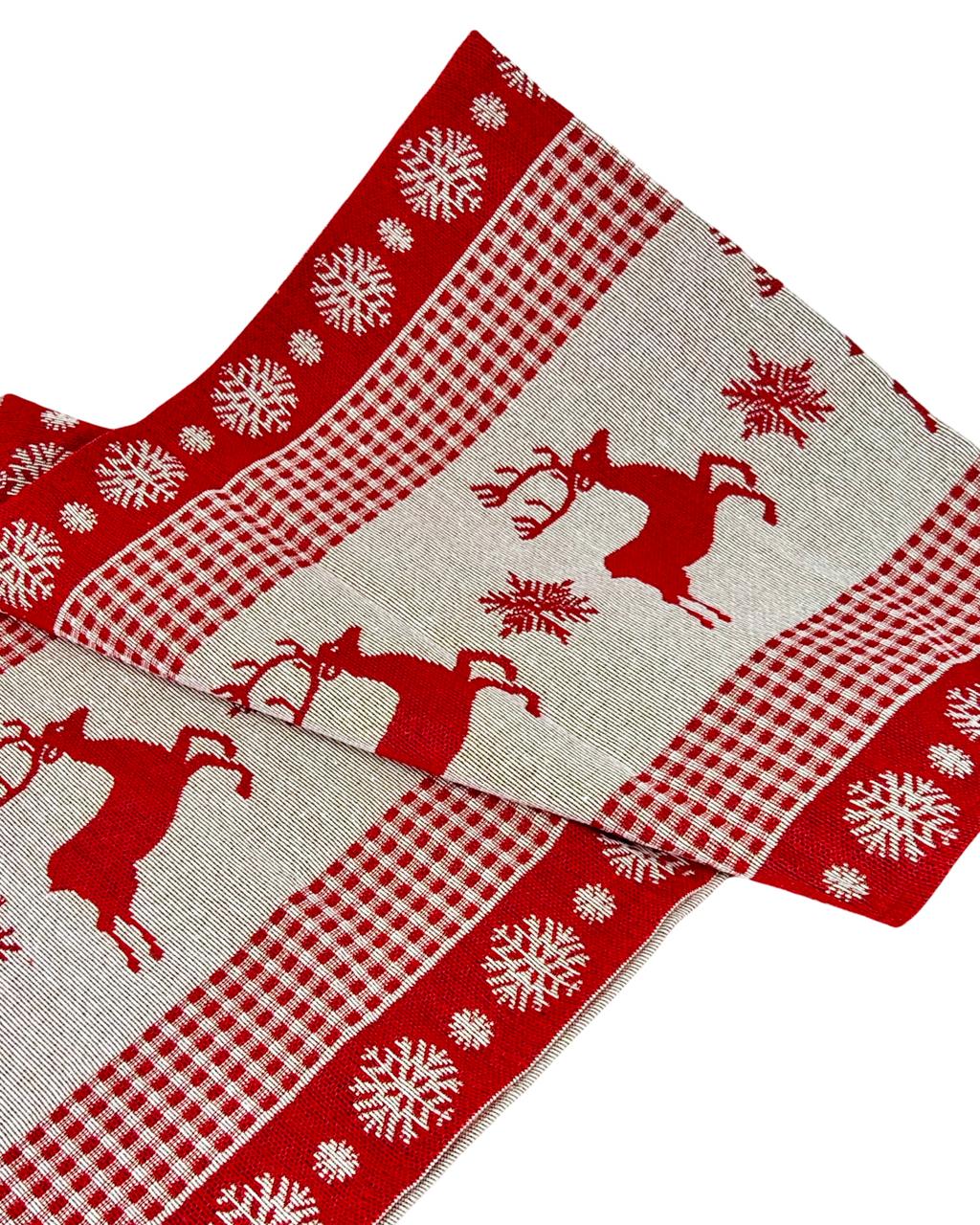 Este camino de mesa jacquard rojo, con delicados motivos de renos, mide 33x180 cm y aporta un toque elegante y festivo a cualquier mesa. Su diseño sofisticado realza la decoración, ideal para celebraciones navideñas o ambientes acogedores, mientras su tejido resistente garantiza durabilidad y fácil mantenimiento. Perfecto para transformar sutilmente el espacio con estilo y distinción.