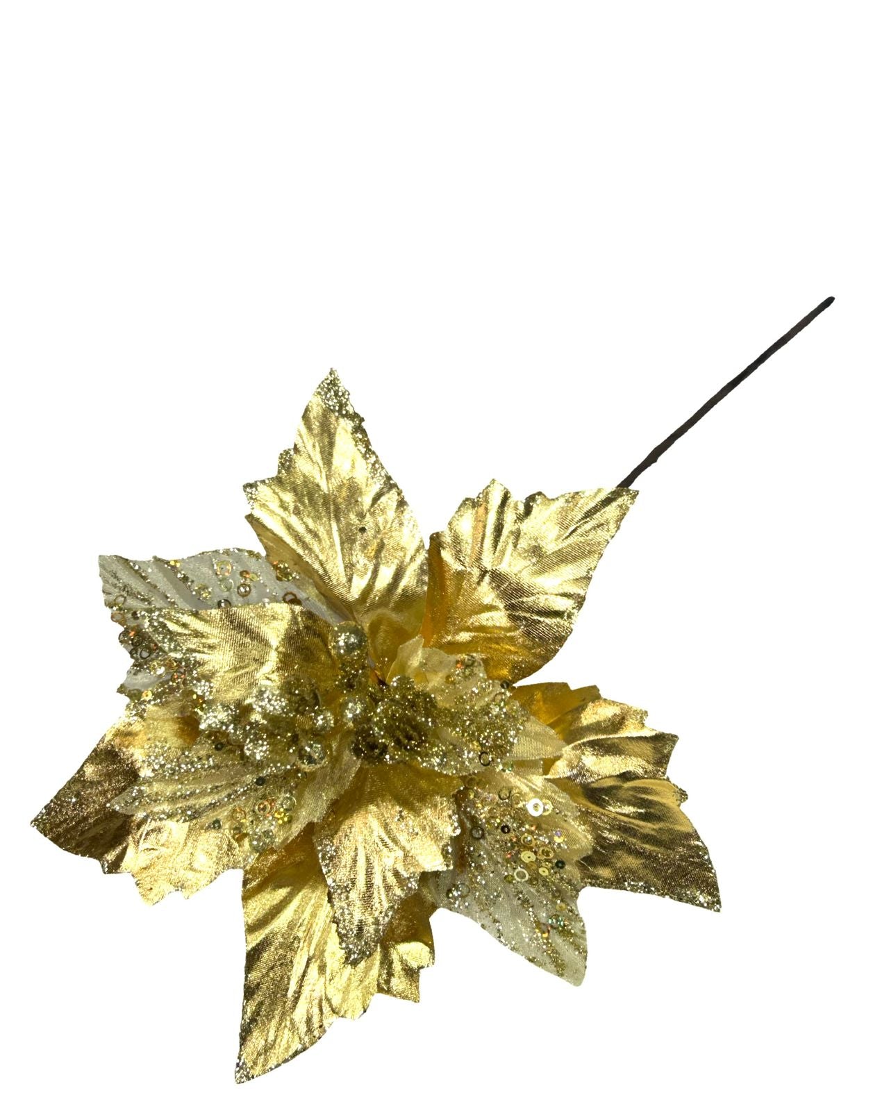 La poinsettia dorada grande de 35 cm destaca por su elegante color dorado que aporta un toque de lujo y sofisticación a cualquier espacio. Su tamaño imponente la convierte en el centro de atención ideal para decorar salones, oficinas o eventos especiales, brindando calidez y un aire festivo sin igual. Perfecta para quienes buscan una decoración distinguida y con presencia.