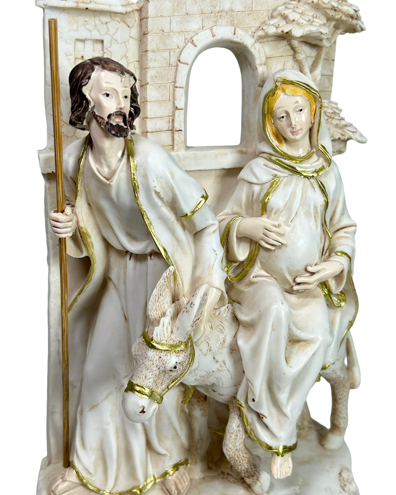 Esta pieza de 28x17 cm representa con elegancia la emblemática escena de la Huida a Egipto, destacando a María durante su embarazo. Su diseño detallado aporta un toque artístico y refinado, ideal para quienes valoran la tradición y el simbolismo en la decoración. Perfecta para espacios que buscan transmitir serenidad y una historia cargada de significado.