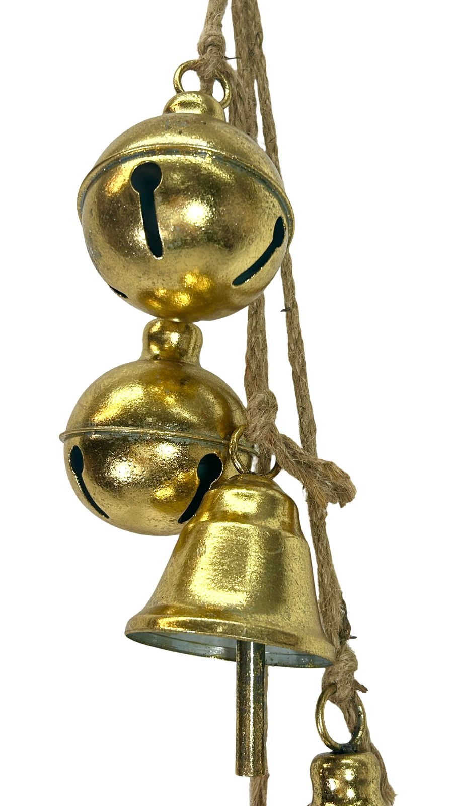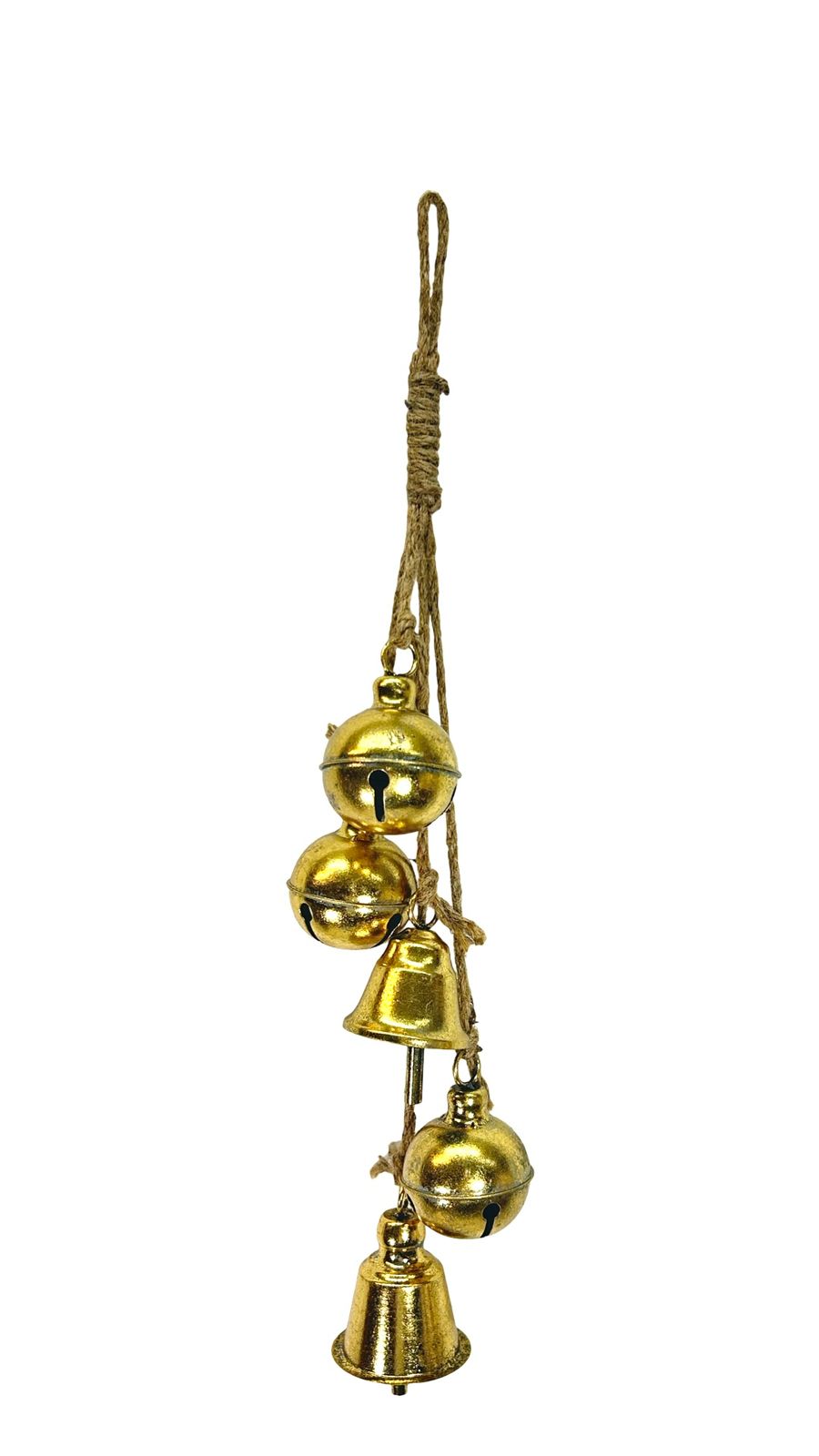 Este móvil dorado con cinco campanas de 60x8 cm aporta un toque elegante y delicado a cualquier espacio. Su acabado brillante realza la decoración, mientras que el suave tintineo de las campanas crea una atmósfera serena y sofisticada. Ideal para ambientes que buscan un equilibrio entre estilo y armonía.
