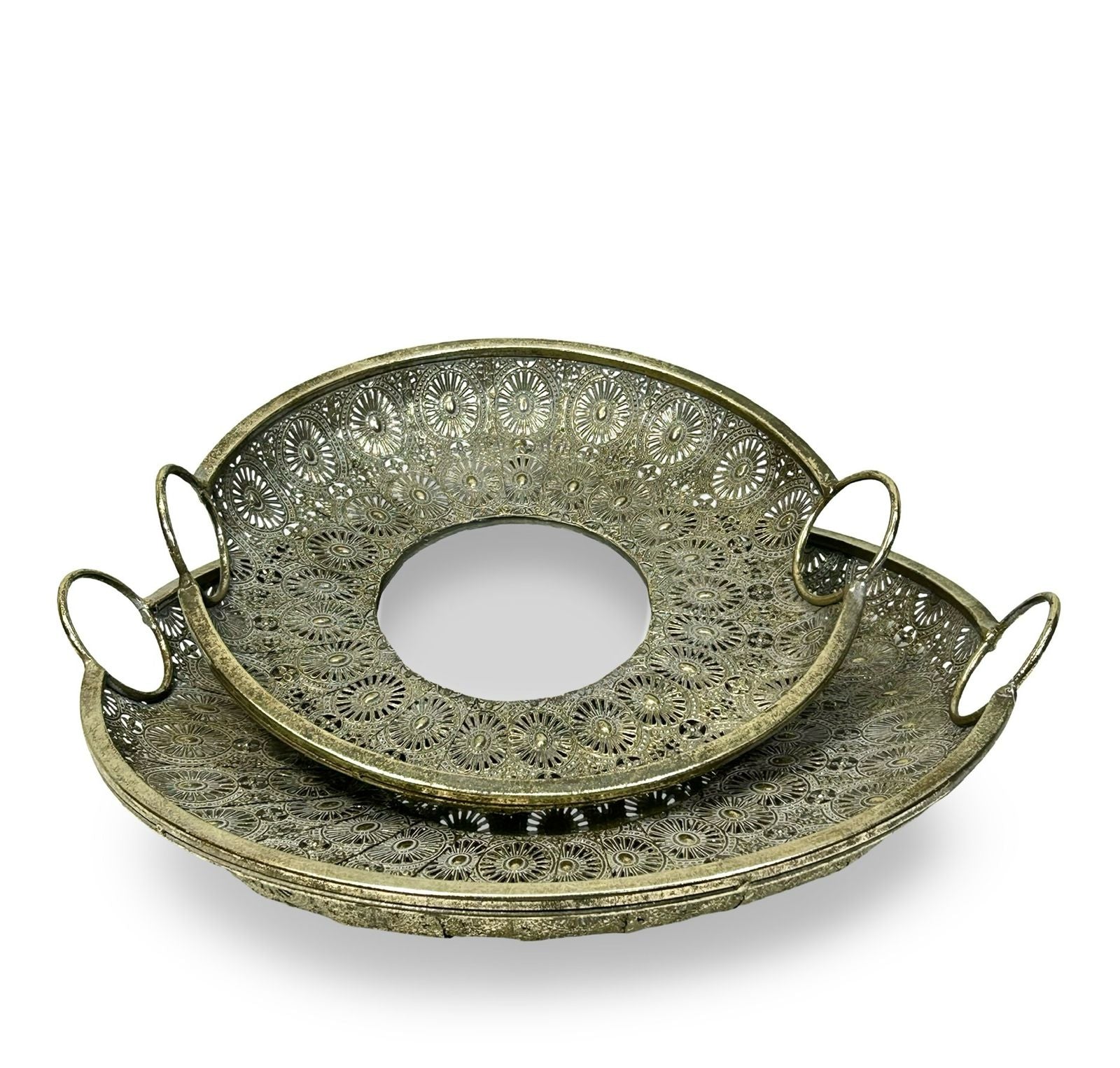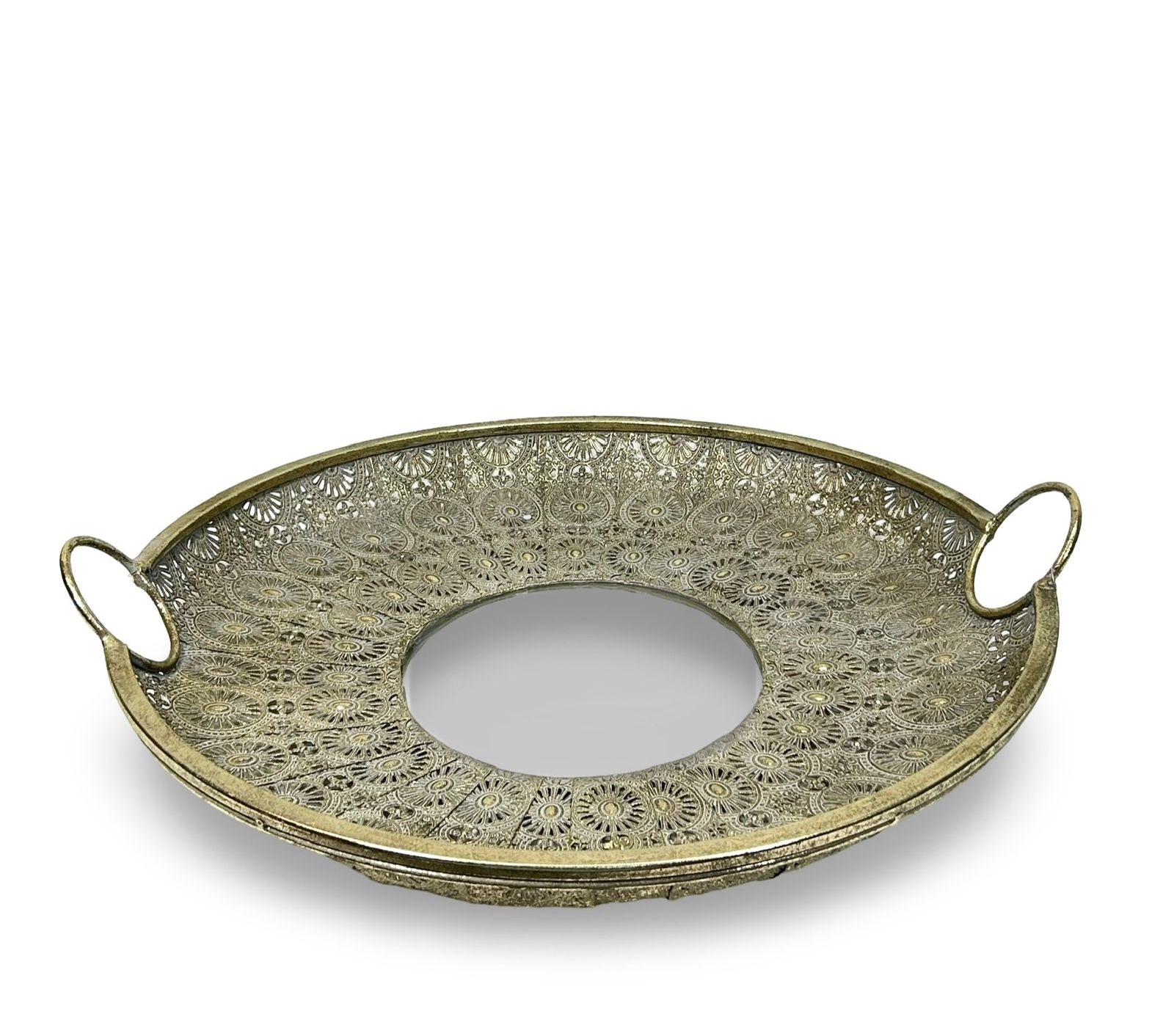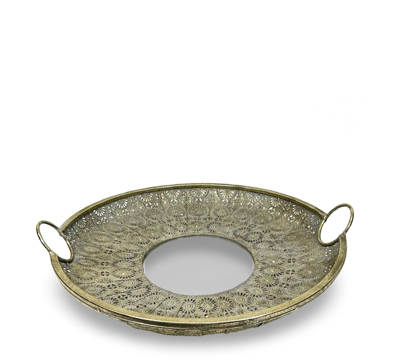 Este centro decorativo presenta un espejo redondo de gran tamaño, adornado con delicados mandalas que aportan un toque de elegancia y serenidad a cualquier espacio. Disponible en dos tamaños, se adapta perfectamente a diferentes ambientes, realzando la decoración con su diseño sofisticado y armonioso. Ideal para quienes buscan combinar funcionalidad y estilo en un solo elemento.