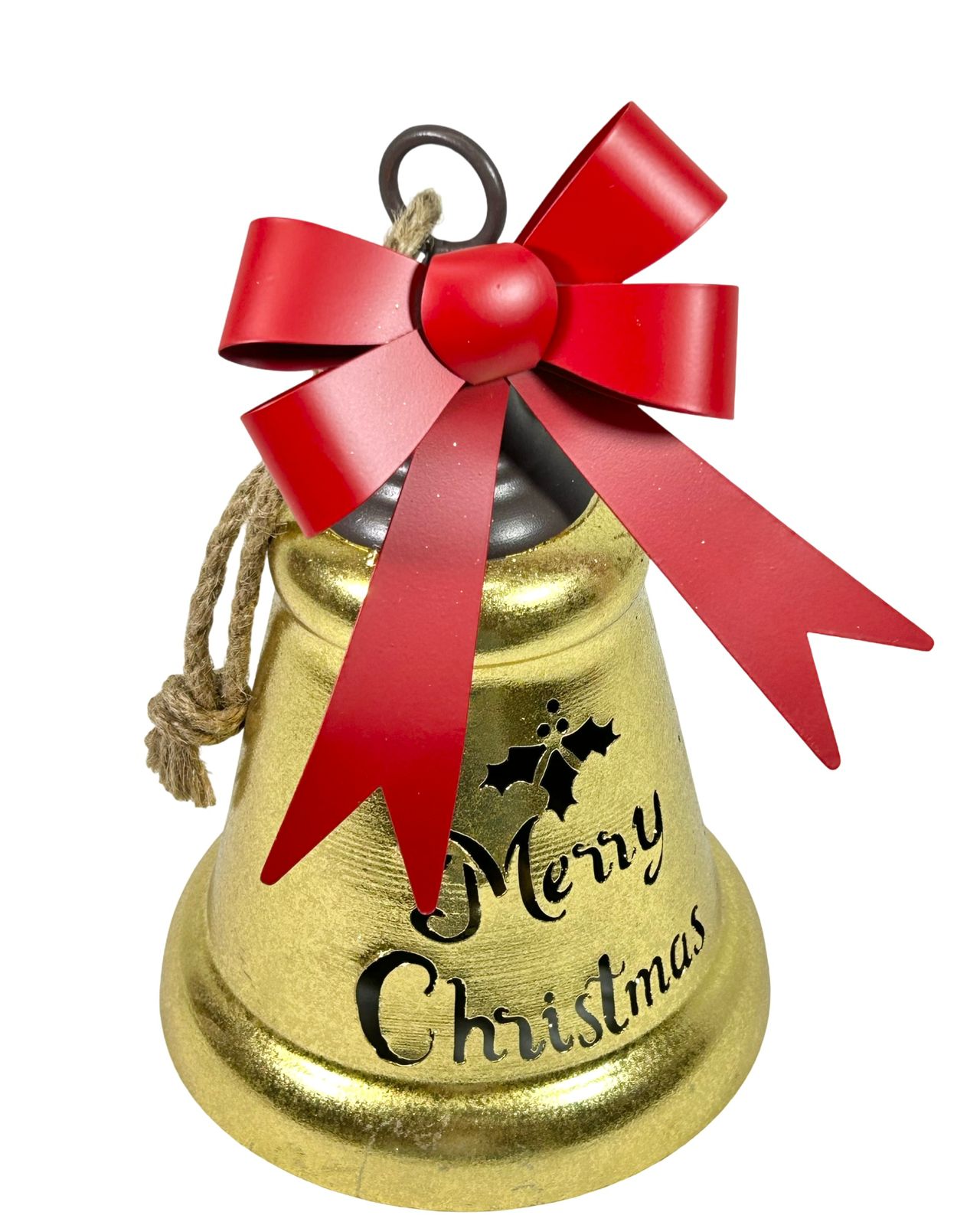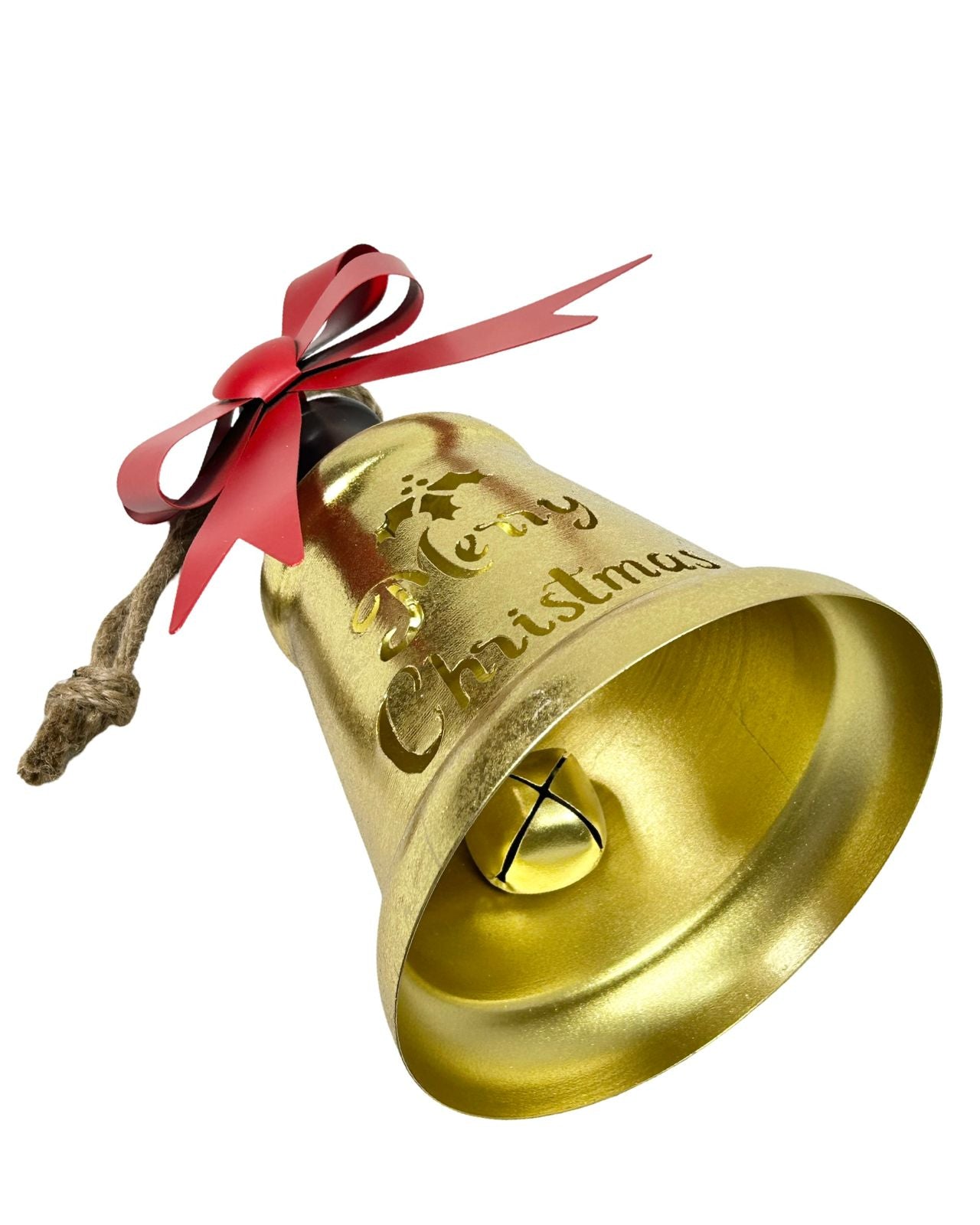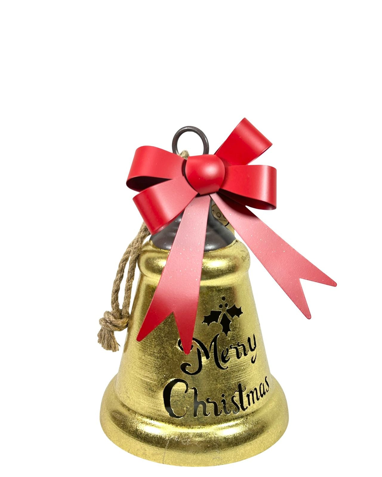 Esta campana dorada de 28x18 cm, adornada con un elegante moño rojo, aporta un toque sofisticado y festivo a cualquier decoración. Su diseño clásico y detalles refinados la convierten en un elemento destacado para celebraciones y ambientes que buscan distinción y calidez. Ideal para complementar espacios con un estilo cuidado y festivo, agregando un brillo sutil y un contraste vibrante gracias al moño rojo.