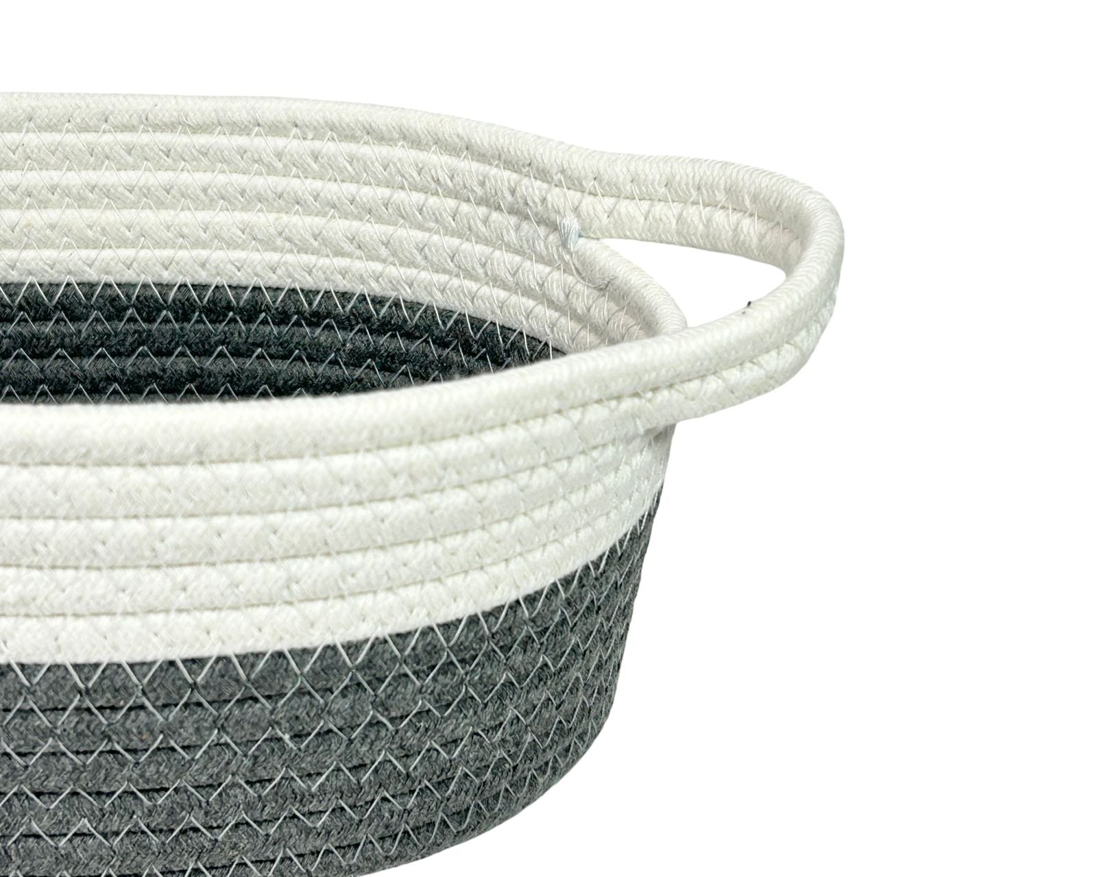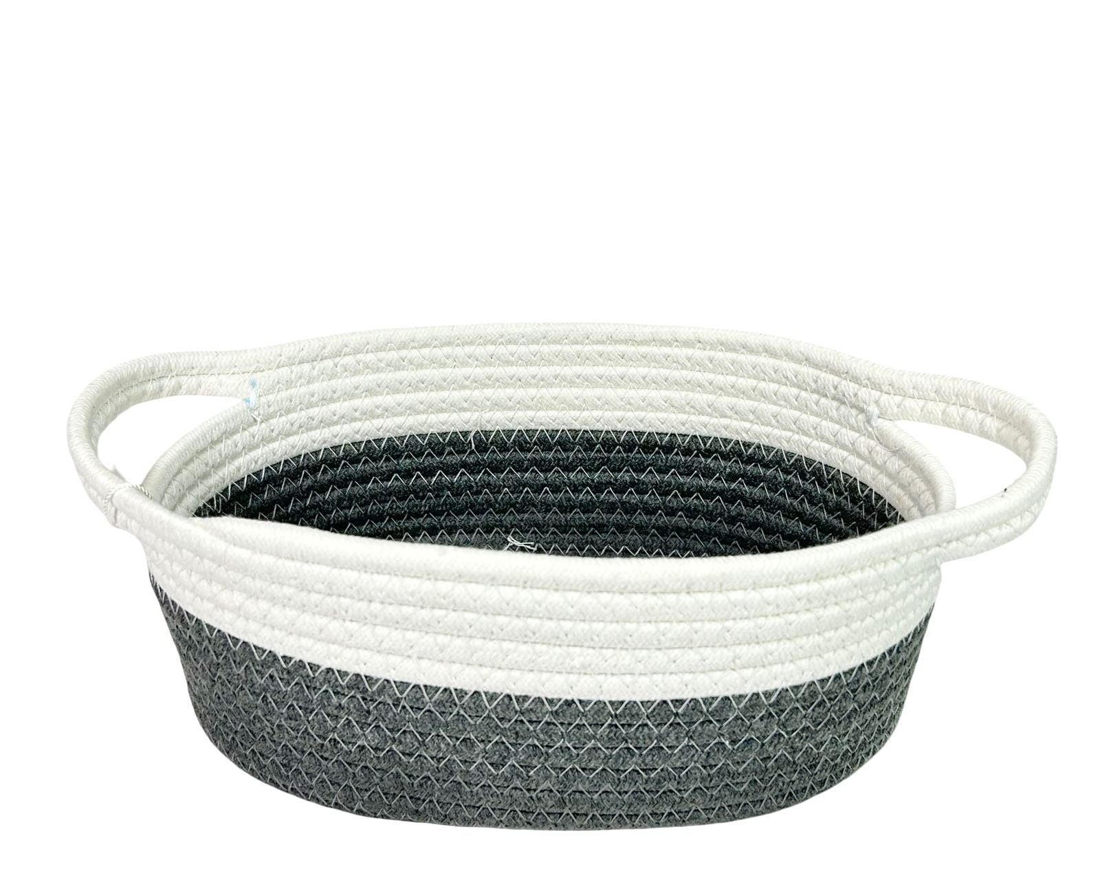 Cesto ovalado tejido en tonos grises que combina funcionalidad y elegancia. Sus dimensiones de 11x30 cm lo hacen ideal para organizar espacios pequeños con estilo. Perfecto para guardar accesorios, cosméticos o artículos de escritorio mientras añade una textura natural a tu decoración. Su tejido artesanal le confiere carácter único, transformando el almacenamiento en un elemento decorativo sofisticado.