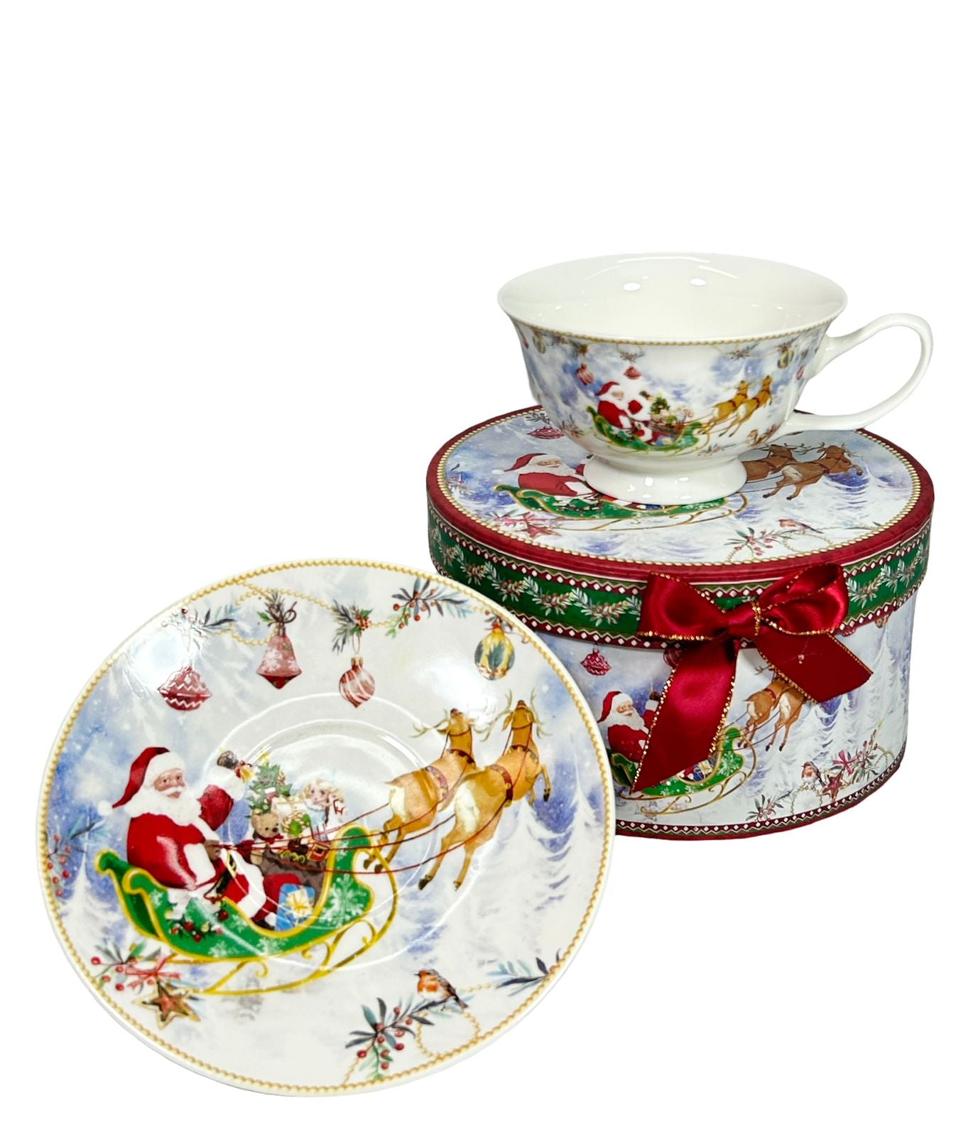 Disfrute de un momento de elegancia con este juego de té para dos, que incluye posillo y plato decorados con motivos de trineo y Santa Claus. Perfecto para ambientar sus reuniones con un toque festivo y sofisticado, este set combina funcionalidad y diseño para elevar su experiencia al tomar té. Ideal para compartir en ocasiones especiales o como un detalle encantador en su colección.