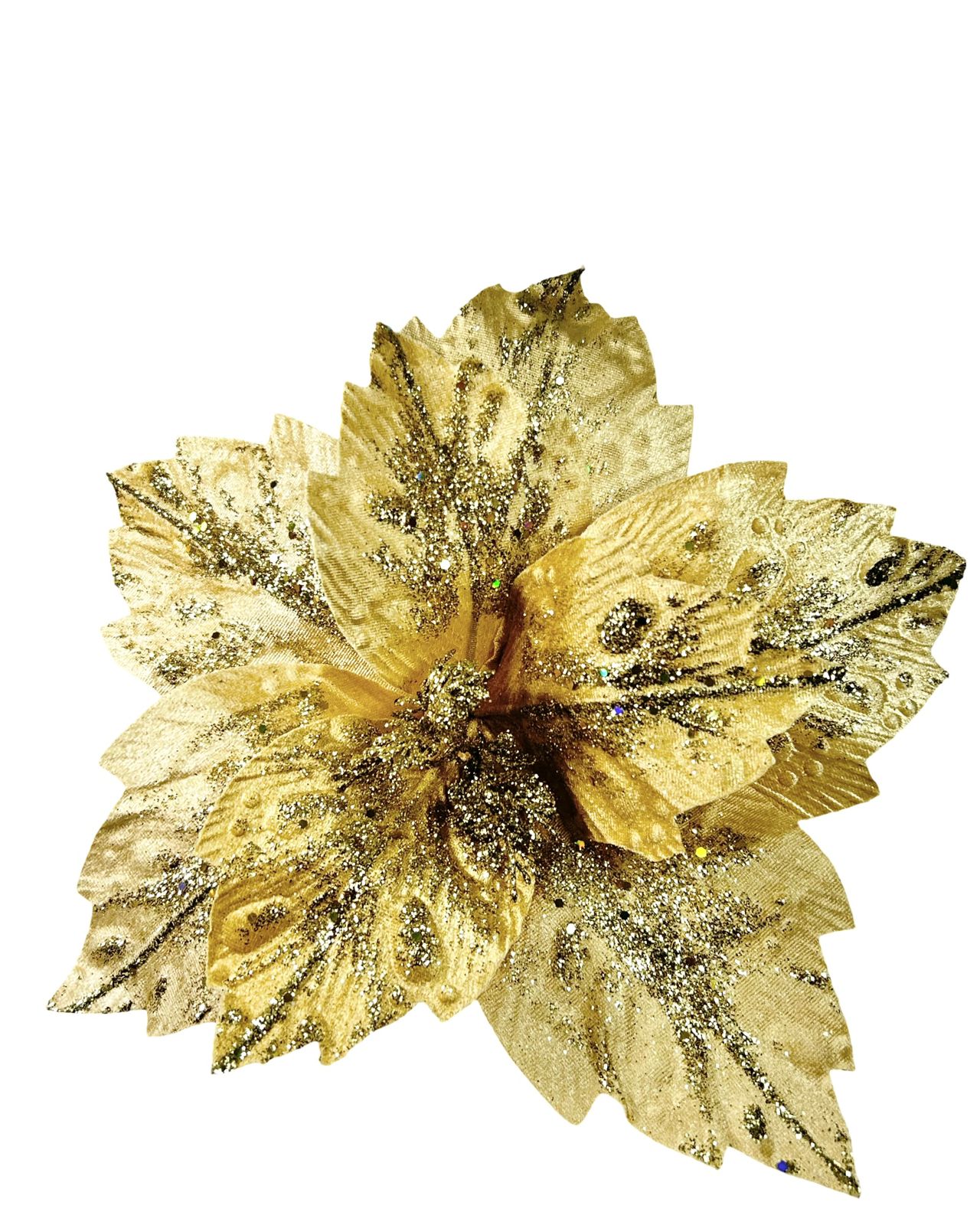 La ponsetia grande dorada de 36 cm de diámetro destaca por su elegante acabado dorado que aporta un toque de sofisticación y calidez a cualquier espacio. Perfecta para decorar en temporadas festivas o realzar ambientes con estilo refinado, su tamaño generoso la convierte en el centro de atención ideal para salones, entradas o mesas principales. Esta pieza combina belleza y presencia para transformar sus espacios con un delicado brillo dorado y un diseño clásico.