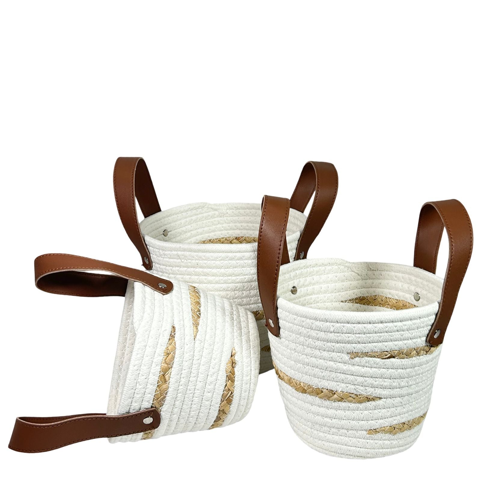 Set de tres cestos tejidos en tonos blancos, diseñados en tamaños progresivos de 17, 14 y 13 centímetros. Perfectos para organizar espacios con elegancia, estos cestos combinan funcionalidad y estética minimalista. Su tejido artesanal aporta textura y calidez a cualquier ambiente, ideal para almacenar accesorios, textiles o elementos decorativos. Una solución versátil que se adapta a diferentes estilos de decoración interior.