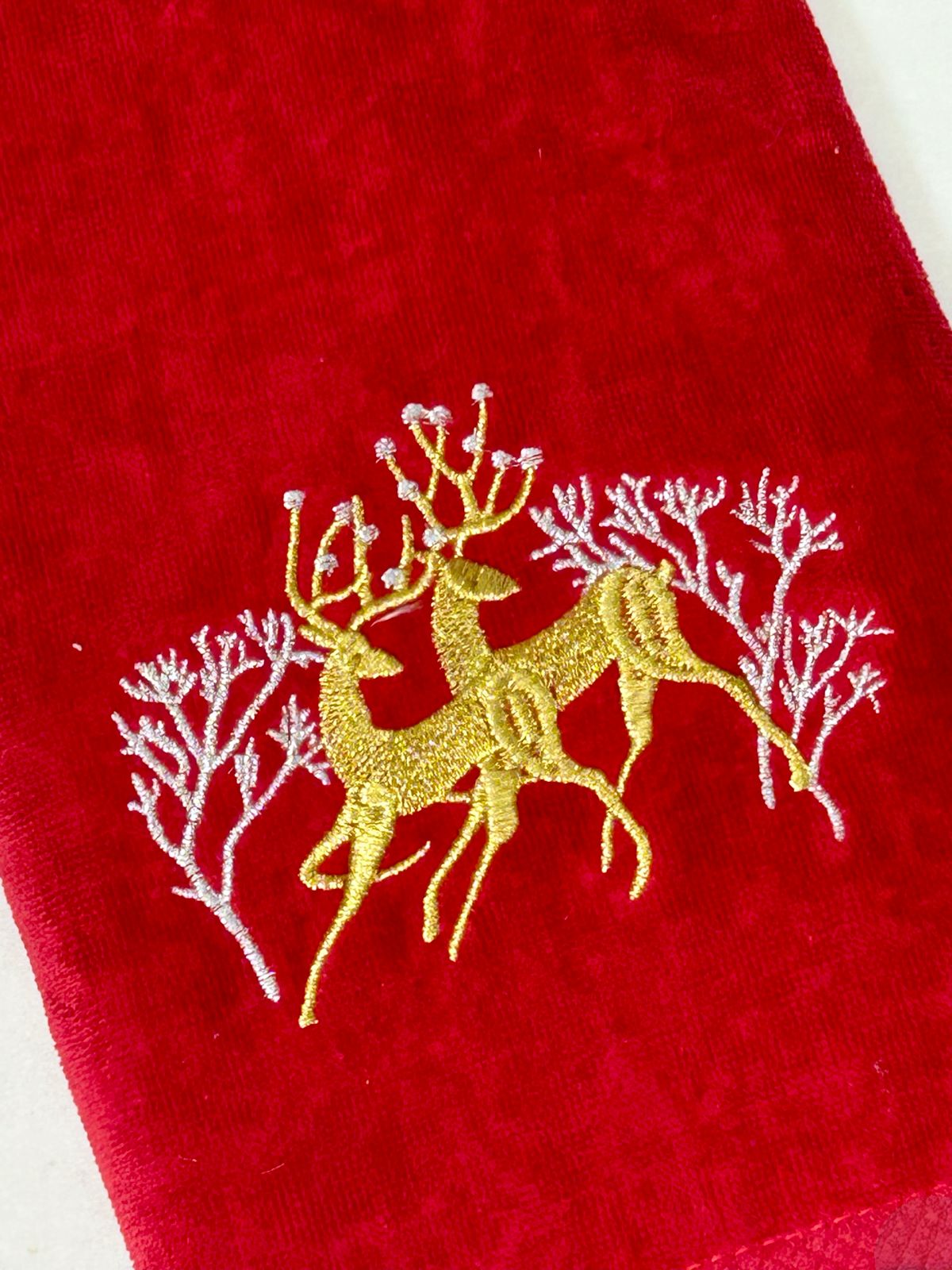 Esta toalla navideña en tono rojo, confeccionada en 100% algodón de alta calidad, pesa 500 g/m² y mide 40x66 cm. Su diseño con renos aporta un toque elegante y festivo, ideal para complementar la decoración de temporada con una textura suave y duradera que garantiza confort y sofisticación en cada uso.